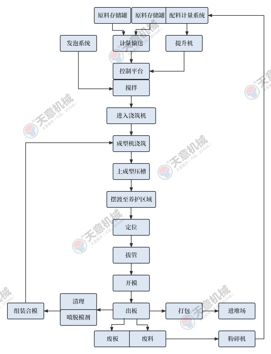TY12型墻板生產(chǎn)線包括:墻板成型機(jī)、整體穿抽管系統(tǒng)、發(fā)泡系統(tǒng)、水箱、電子計(jì)量?jī)?chǔ)料倉(cāng)、螺旋上料輸送機(jī)、儲(chǔ)料罐、螺旋輸送機(jī)、EPS熟化料倉(cāng)、硫化干燥床、EPS預(yù)發(fā)機(jī)、數(shù)控配電室、發(fā)泡攪拌機(jī)、整體出板系統(tǒng)、叉車、成品堆放區(qū)、擺渡車。