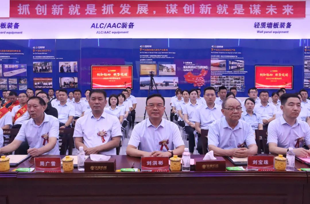 最后,集團(tuán)董事長劉洪彬做集團(tuán)總結(jié)及未來展望。劉總指出,天意上半年發(fā)展呈現(xiàn)三方面特點,第一,創(chuàng)新驅(qū)動:以創(chuàng)新為市場回暖積蓄力量。上半年,研發(fā)了模塊智能化柔性生產(chǎn)線,為模塊化房屋建造提供智能裝備,研發(fā)了光伏清掃機(jī)器人,提供光伏電站清潔解決方案。天意榮獲山東省五一勞動獎狀,入選山東省先進(jìn)級智能工廠、省級專家服務(wù)基地,卓越也建成了新的工業(yè)互聯(lián)網(wǎng)展廳。上半年,產(chǎn)學(xué)研合作邁出新步伐,天意與山東大學(xué)共同舉辦了“天意杯”山東大學(xué)第五屆智造未來創(chuàng)新大賽,山東交通學(xué)院黨委書記王偉一行、山東建筑大學(xué)校黨委常委、副校長邱立平一行來集團(tuán)參觀座談,共謀發(fā)展新篇章。第二,國際市場:用中國智造點亮"一帶一路"。上半年,天意參加了俄羅斯國際工程機(jī)械展、廣交會、德國寶馬展、漢諾威工業(yè)博覽會、沙特阿拉伯利雅得五大行業(yè)展覽會等重量級國際展會。塔吉克斯坦總統(tǒng)親臨考察的墻板項目,成為當(dāng)?shù)鼐G色建筑的示范工程。與俄羅斯客戶簽訂了ALC和PC大單。這些突破不僅帶來了42%的出口增長,更讓中國建材高端裝備贏得了世界尊重。第三,強(qiáng)勢突圍:三大引擎驅(qū)動未來發(fā)展。在鞏固裝配式建筑裝備主業(yè)的同時,培育了三大新增長極,分別是光伏清掃機(jī)器人(已具備智能導(dǎo)航、自主清潔、高效節(jié)能等特點)、智慧物流(目前已有京東、拼多多、好想來等大型企業(yè)入駐)、新能源業(yè)務(wù)板塊(天意已實現(xiàn)了80%的綠電生產(chǎn),正在搭建離網(wǎng)儲能系統(tǒng),未來還將建設(shè)微電網(wǎng)和虛擬電廠)。