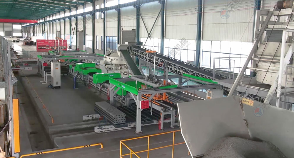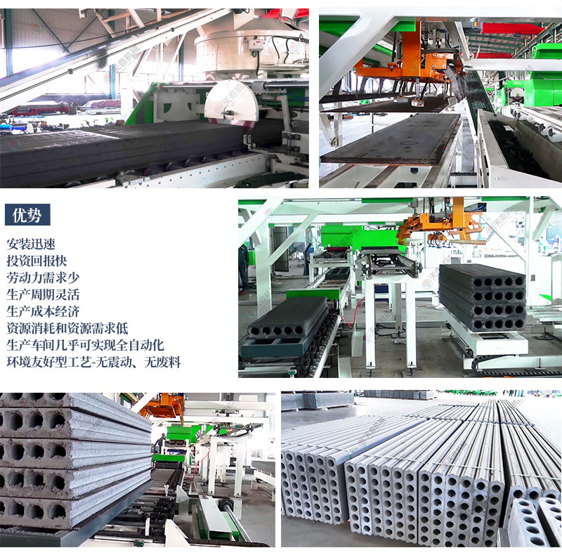 擠壓墻板生產(chǎn)線結(jié)構(gòu)緊湊,自動(dòng)化程度高,設(shè)備主機(jī)固定,墻板成型時(shí)物料受擠壓和振動(dòng)同時(shí)作用,連續(xù)自動(dòng)擠壓振搗成型,保證墻板具有良好的密實(shí)性和外形尺寸,成型后進(jìn)行初凝養(yǎng)護(hù)。板坯移動(dòng)方便,場地使用靈活、利用效率高。成型工段推料擠壓螺旋變頻調(diào)速,由中央控制器調(diào)整控制灰渣板成型的密實(shí)程度,實(shí)現(xiàn)灰渣板的連續(xù)自動(dòng)流水線生產(chǎn)。由于采用低水灰比的干硬性混合料擠壓成型,可得到強(qiáng)度和密實(shí)度較高的空心墻板。自動(dòng)化連續(xù)生產(chǎn),效率高,質(zhì)量一致性高,保障了墻板品質(zhì)。廣泛用于框架結(jié)構(gòu)和鋼結(jié)構(gòu)建筑物。