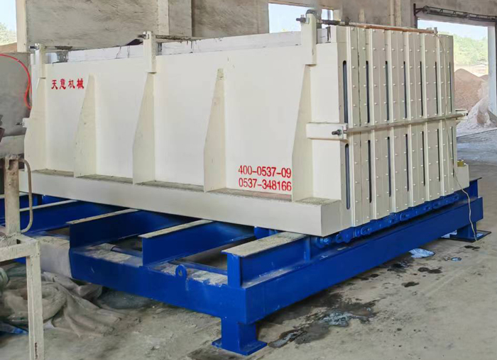 工作原理:模具的開(kāi)合由下方的液壓機(jī)構(gòu)完成,和墻板機(jī)類(lèi)似。合模后的鎖緊由上方和兩端的拉桿裝置實(shí)現(xiàn)。下方的強(qiáng)制同步裝置保證了大板在開(kāi)合時(shí)的兩側(cè)同步。大板下方的輪組保證了大板在開(kāi)合時(shí)不傾斜、不倒伏。